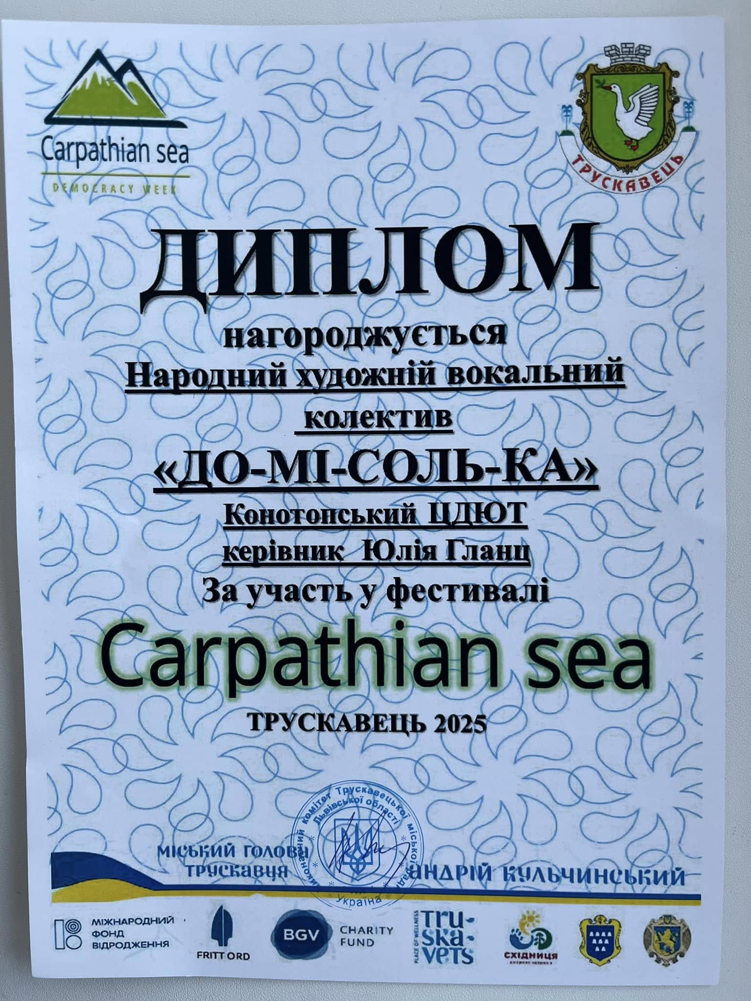 Народний Художній вокальний колектив До-Мі-Соль-ка став учасником Фестивалю «Carpathian Sea», в рамках Форуму “Демократичний Тиждень Карпатського Моря”, що проходив в місті Трускавець в останні дні квітня.
