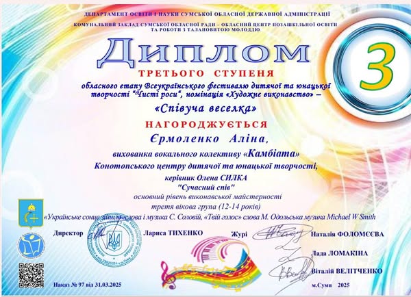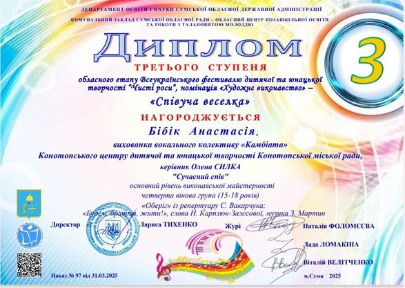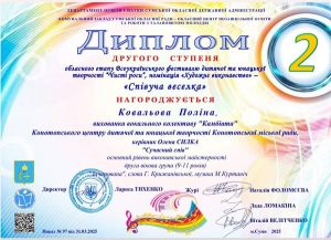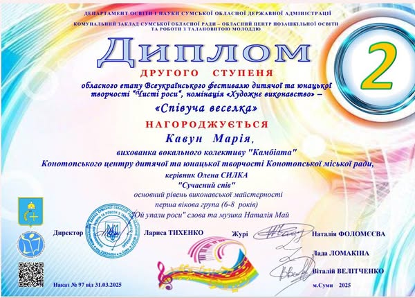 29 – 30 березня 2025 року у заочному форматі було проведено обласний етап Всеукраїнського фестивалю дитячої та юнацької творчості “Чисті роси”, номінація “Художнє виконавство” – “Співоча веселка”.