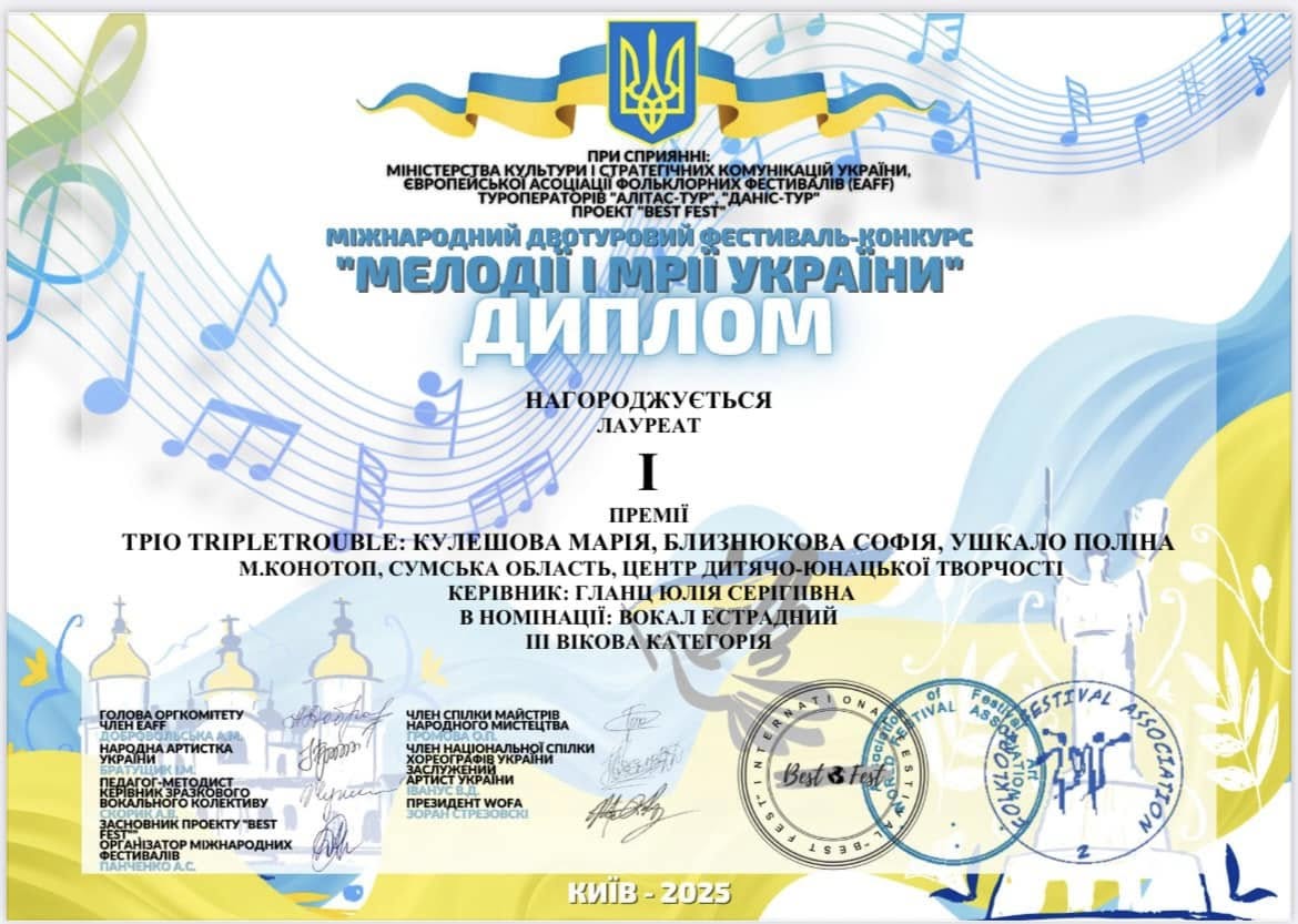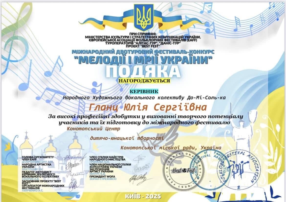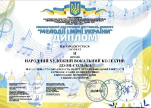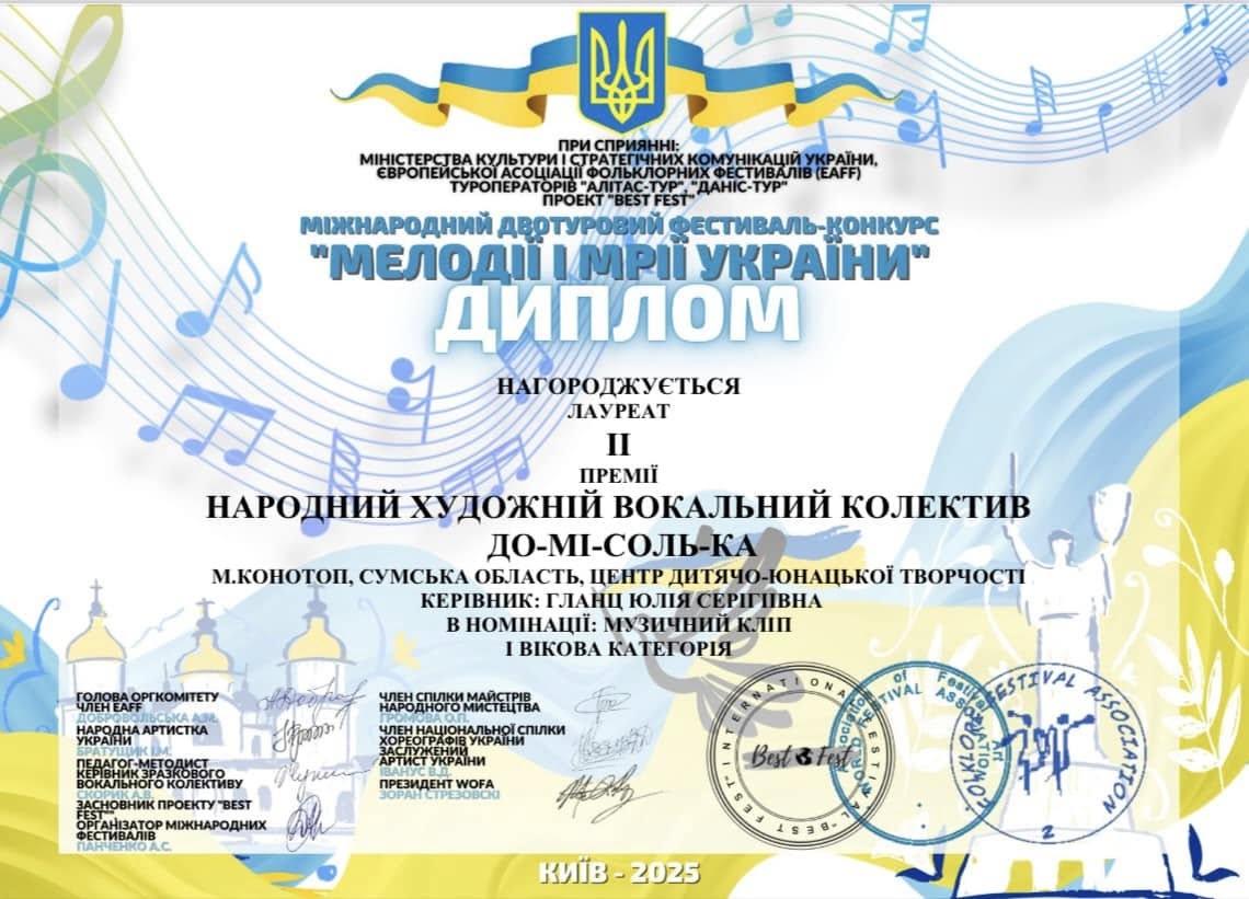 Вітаємо вокалістів колективу До-Мі-Соль-ка з високими результатами у Міжнародному фестивалі-конкурсі “MELODIES AND DREAMS OF UKRAINE 2025” від проекту «Квітуча Україна» що відбувся 18.08.2025