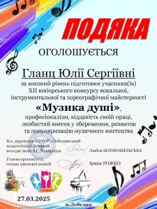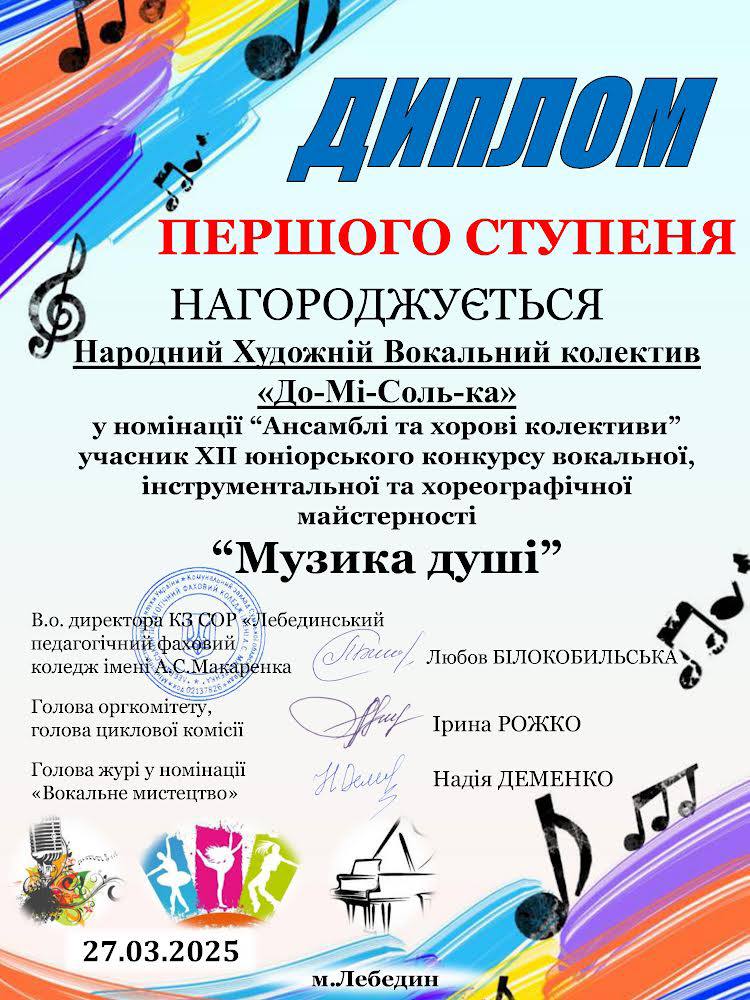 Вітаємо Народний художній вокальний колектив «До-Мі-Соль-ка» з перемогами у номінації «Ансамблі та хорові колективи», учасник ХІІ юніорського конкурсу вокальної, інструментальної та хореографічної майстерності «Музика душі» за зайняте: