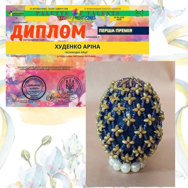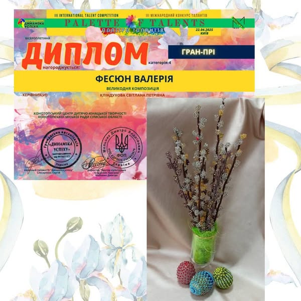 Ніщо так не гріє душу у прохолодну погоду як заслужені нагороди у ІІІ Міжнародному конкурсі талантів «Палітра талантів». Великодні композиції вихованок гуртка «Аксесуарне моделювання» (керівник Кліндухова Світлана Петрівна) вразили журі конкурсу і отримали призові місця.