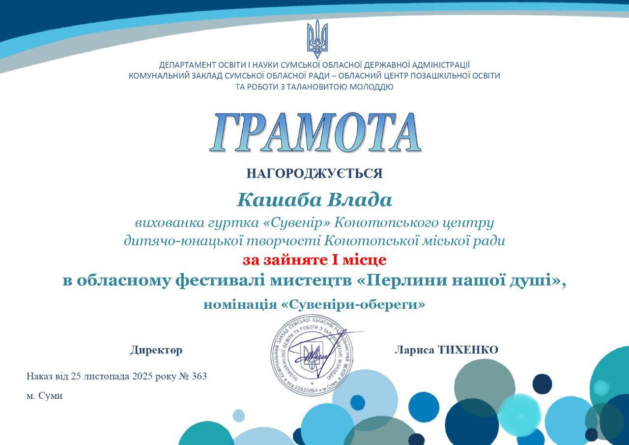 Вітаємо талановитих юних майстринь Бойко Анну, вихованку гуртка «Колорит», та Кашабу Владу, вихованку гуртка «Сувенір», з перемогою в Обласному фестивалі мистецтв «Перлини нашої душі»!