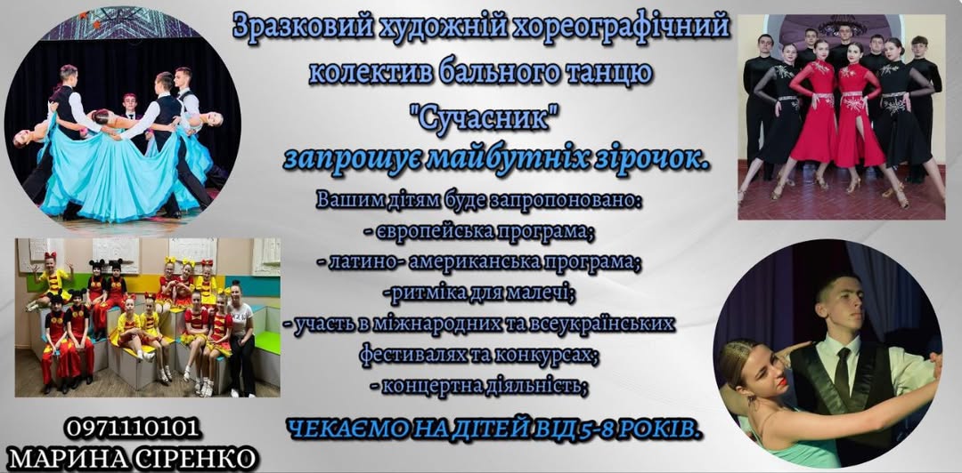 Зразковий художній хореографічний колектив бального танцю”Сучасник” проводить додатковий набір дітей. by Дмитро Капітонов · 11 Вересня, 2025 Увага!!! Зразковий художній хореографічний колектив бального танцю”Сучасник” Центру дитячо-юнацької творчості проводить додатковий набір дітей. Якщо ваша дитина любить музику, рух і мріє про яскраві перемоги, чекаємо її на наших заняттях!